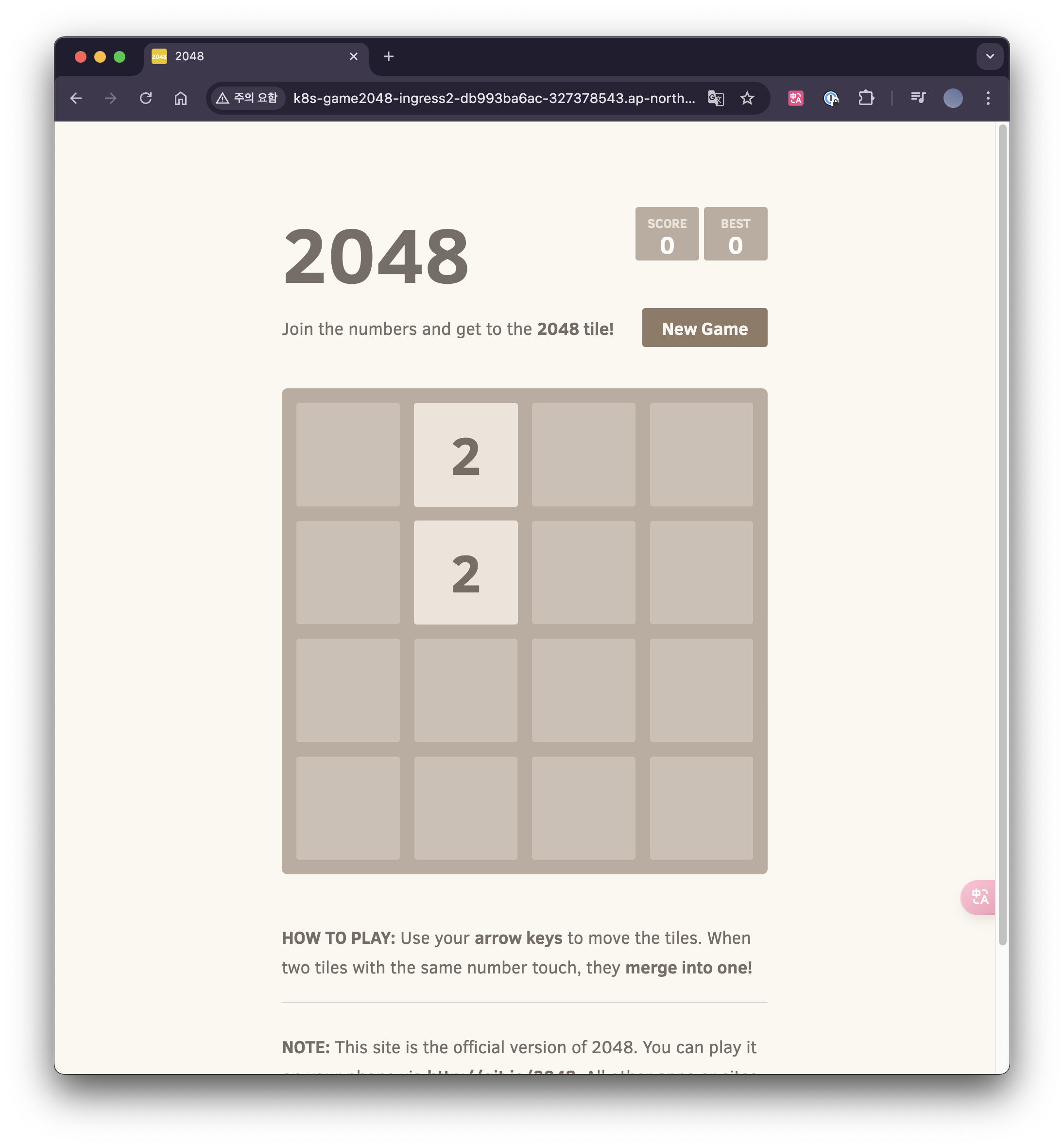 위에서 생성한 Pod와 마찬가지로 예제로 수록되어있는 2048-ingress.yaml 파일을 배포합니다.