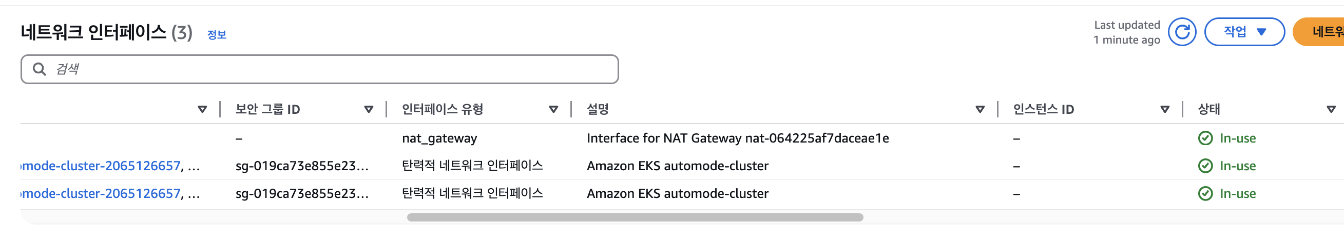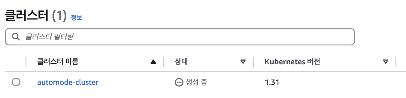 aws console에 접근해서 확인해보면 위와 같이 automode-cluster라는 이름으로 cluster가 생성 중인 것을 확인하실 수 있습니다.