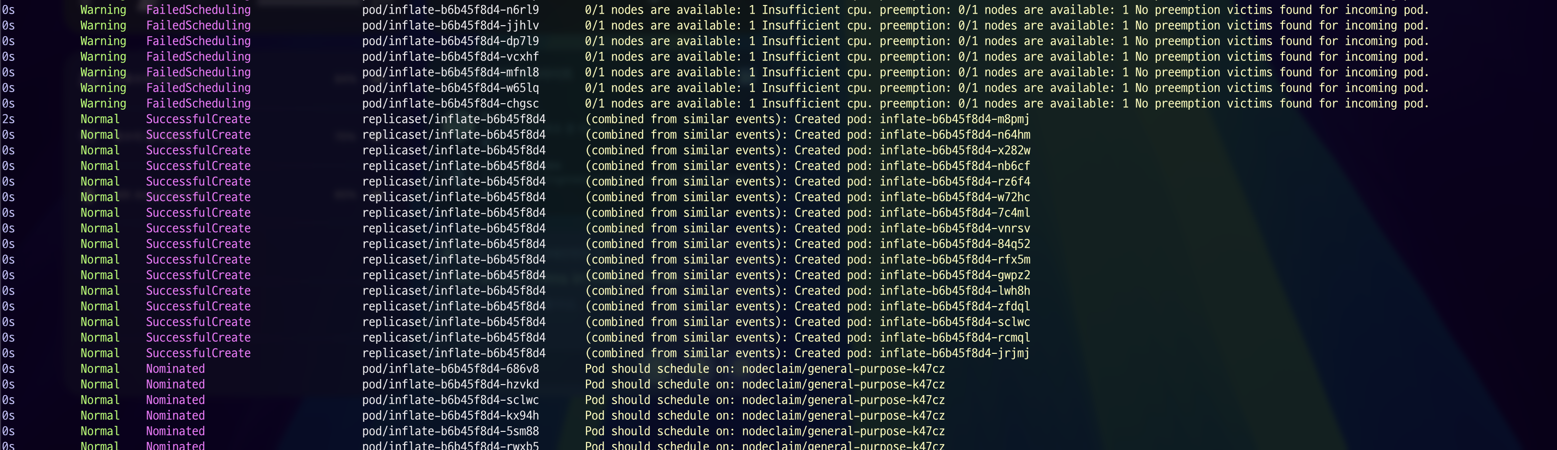 kubectl scale deployment inflate --replicas 100 && kubectl get events -w --sort-by '.lastTimestamp'