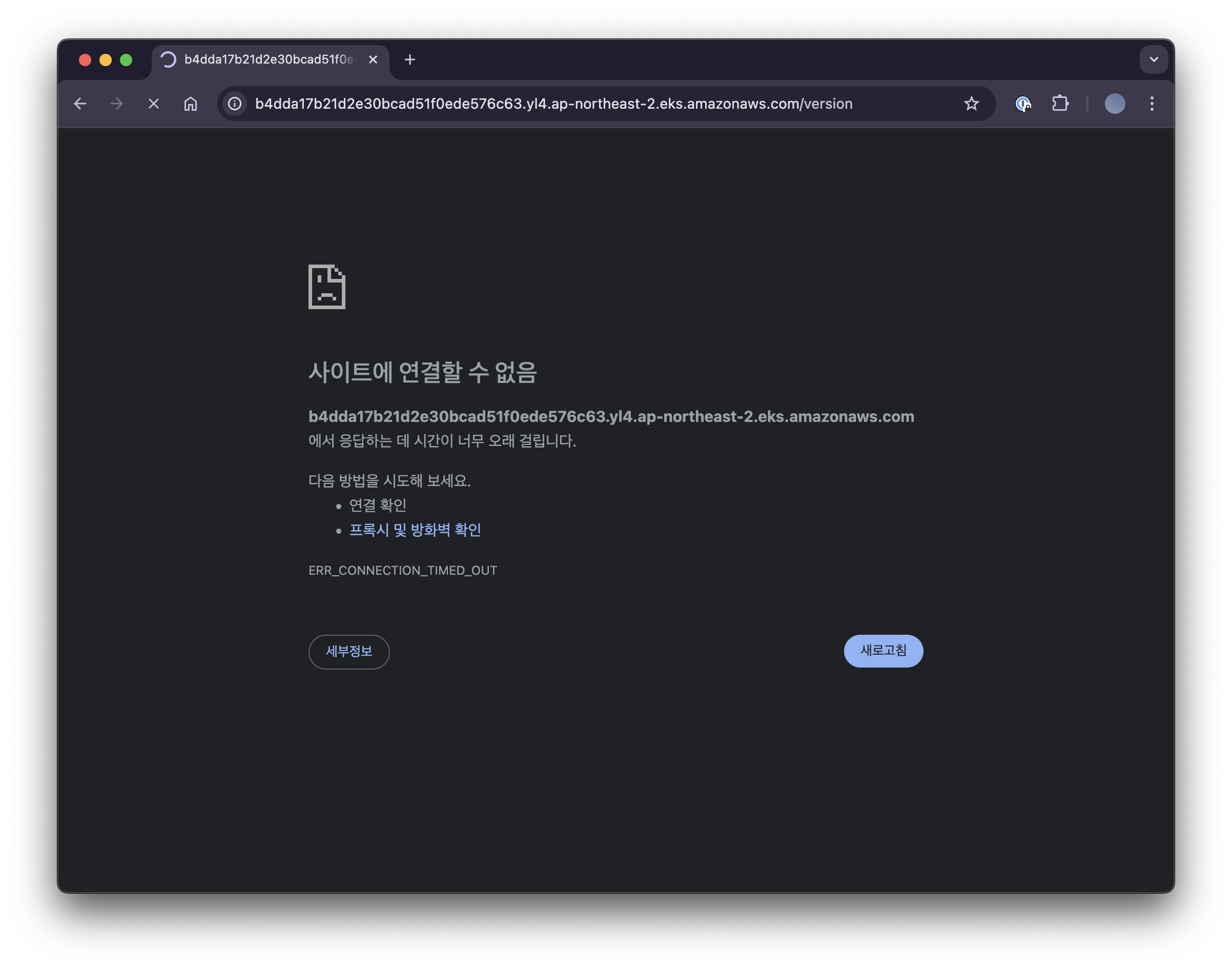 aws cli로 응답받은 endpoint로 접근 시 접근이 불가능한 것을 확인하실 수 있습니다.