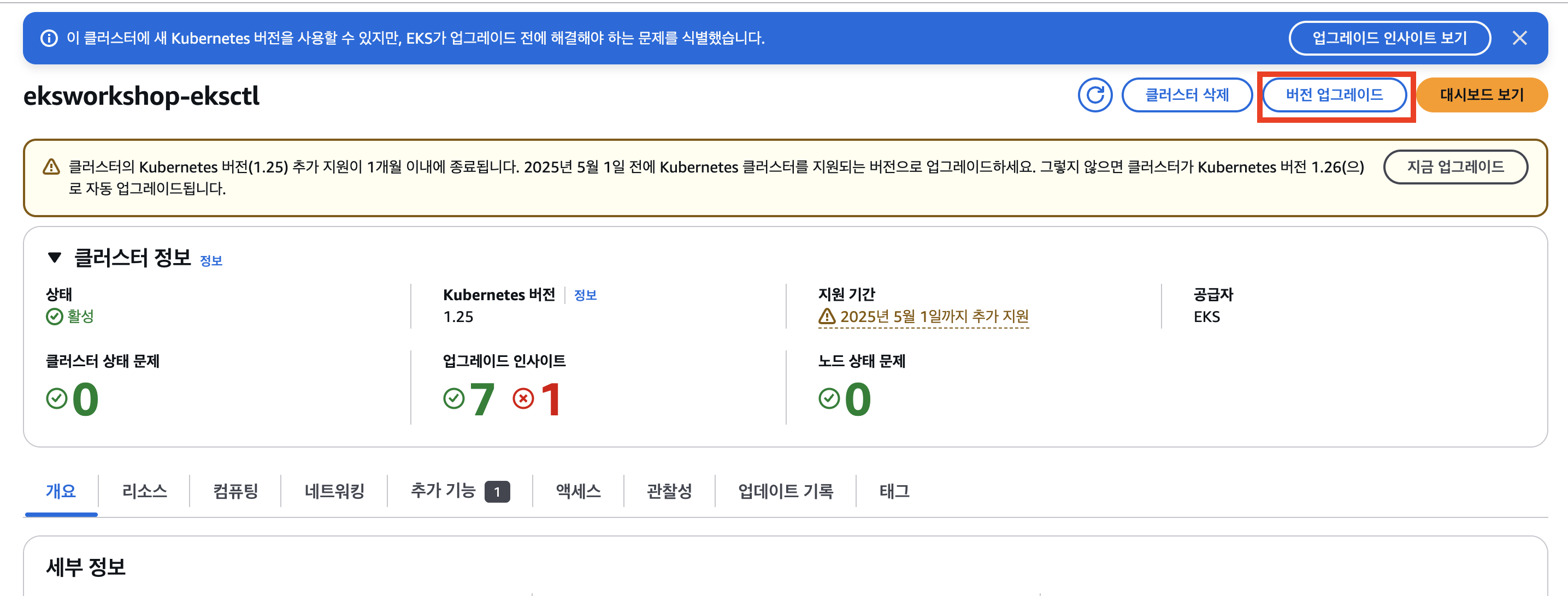 AWS Managed Console에서 EKS 메뉴로 접근하신 후 업그레이드를 진행할 Cluster 클릭 후 상단에 버전 업그레이드 버튼을 클릭합니낟.