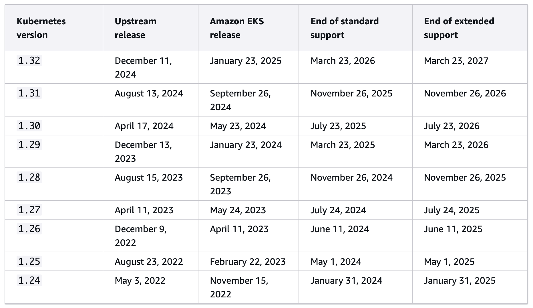 2024년 7월 23일, Amazon EKS는 Kubernetes 버전 정책에 대한 Amazon EKS 제어를 통해 클러스터 관리자는 EKS 클러스터에 대한 표준 지원 동작 종료를 선택할 수 있습니다. 이러한 제어를 통해 어떤 클러스터가 확장 지원을 받아야 하는지와 Kubernetes 버전에 대한 표준 지원 종료 시 자동으로 업그레이드되어야 하는지 결정할 수 있습니다. 이 제어는 클러스터별로 실행되는 환경이나 애플리케이션에 따라 버전 업그레이드를 비즈니스 요구 사항과 균형 있게 조정할 수 있는 유연성을 제공합니다.