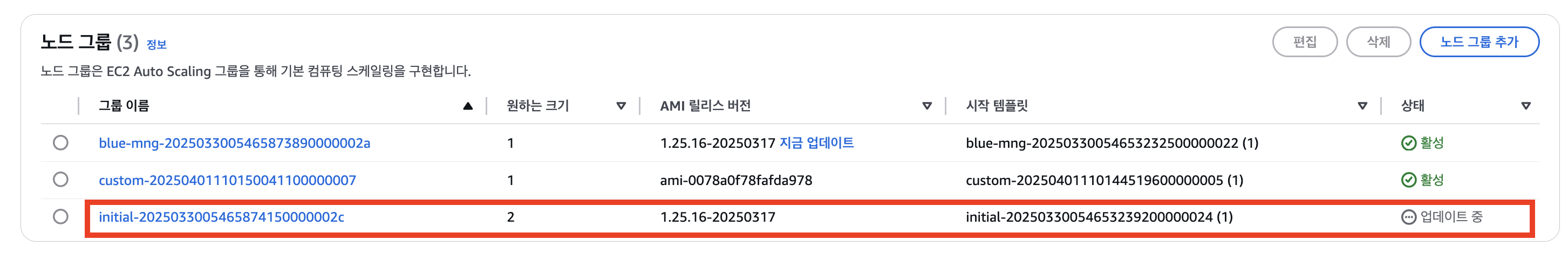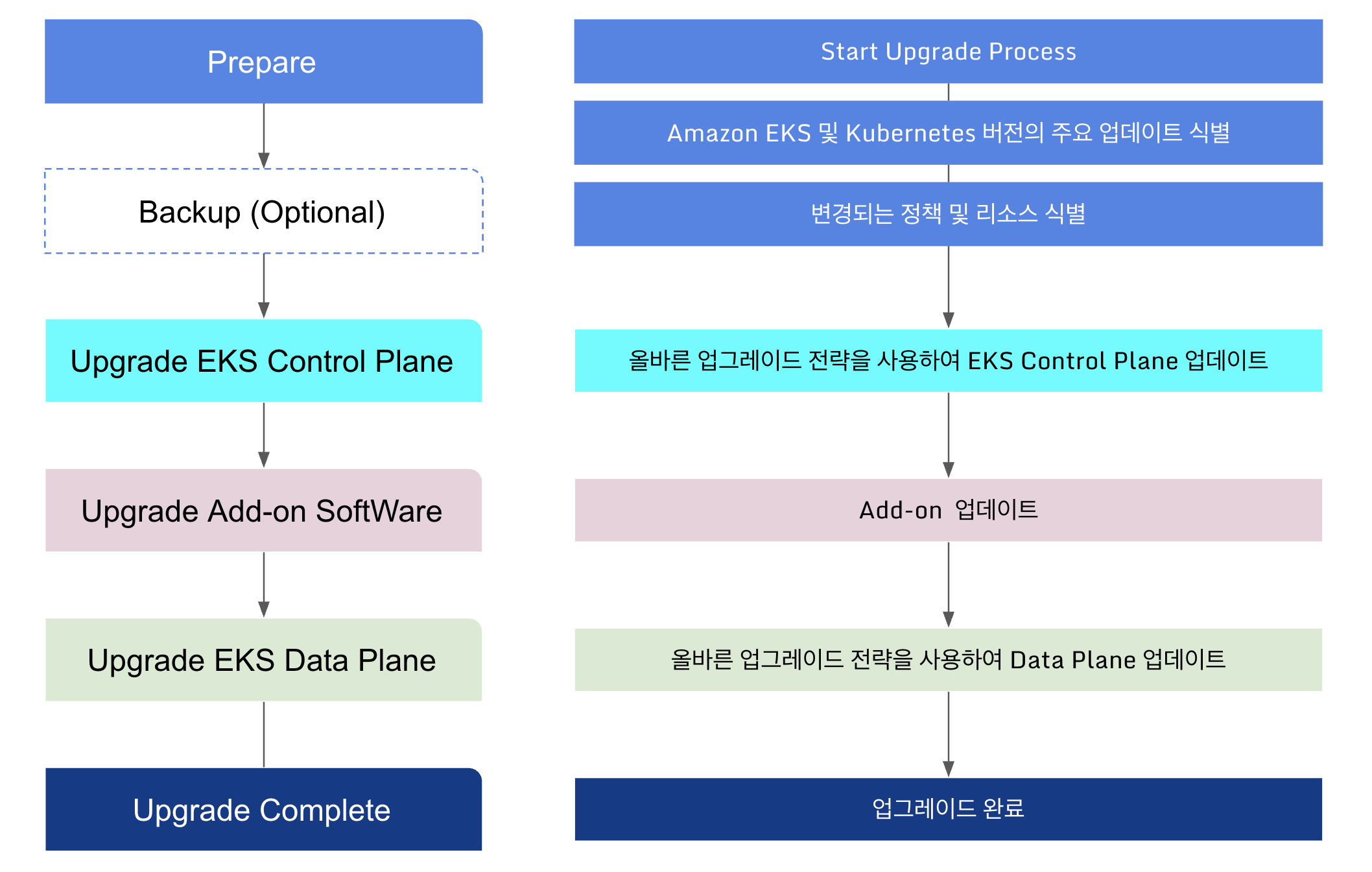 | VPC, 서브넷, 보안 그룹 등 기존 클러스터 리소스와 구성 유지 | 업그레이드 과정에서 가동 중지 시간을 최소화하려면 신중한 계획과 조정이 필요 |