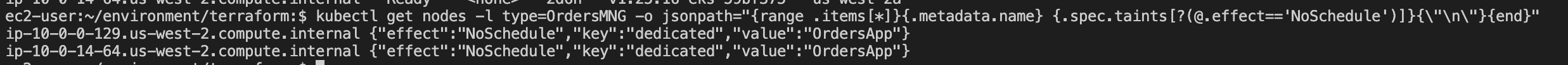kubectl get nodes -l type=OrdersMNG -o jsonpath="{range .items[*]}{.metadata.name} {.spec.taints[?(@.effect=='NoSchedule')]}{\"\n\"}{end}"