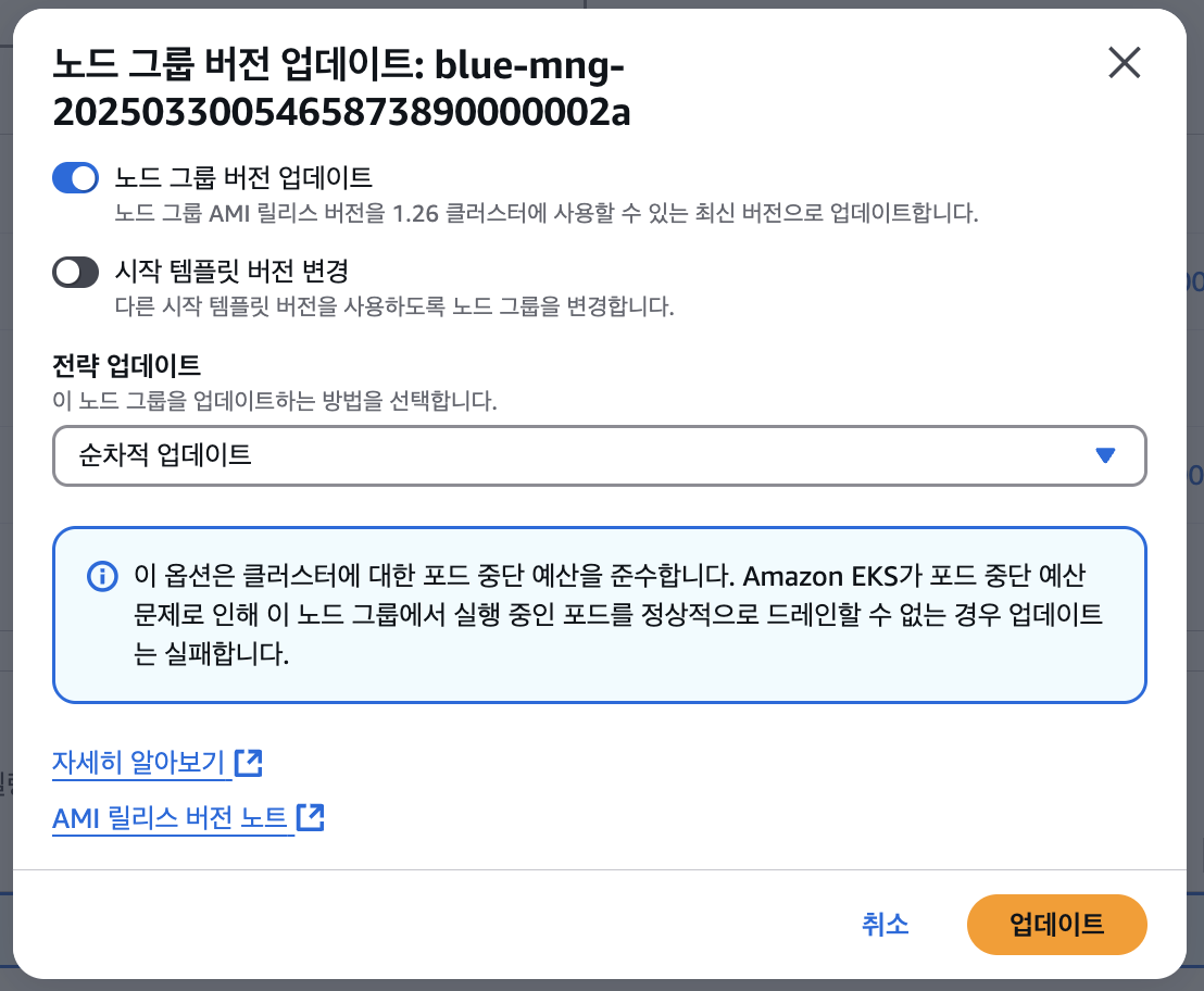 EKS 메뉴에서 컴퓨팅 > 노드 그룹에 보이는 노드 그룹의 [ 지금 업데이트 ] 버튼을 클릭하면 아래와 같이 수동으로 업그레이드가 가능합니다.