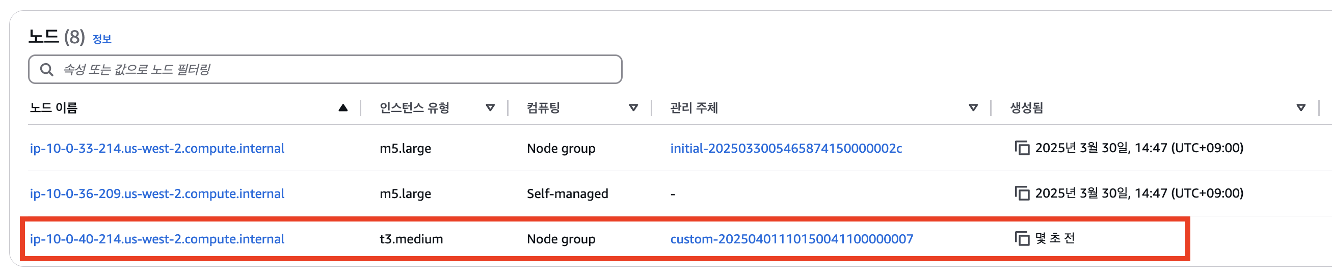terraform apply를 진행한 후 약 2분 정도 지나면 새로운 managed node group이 생성됩니다.