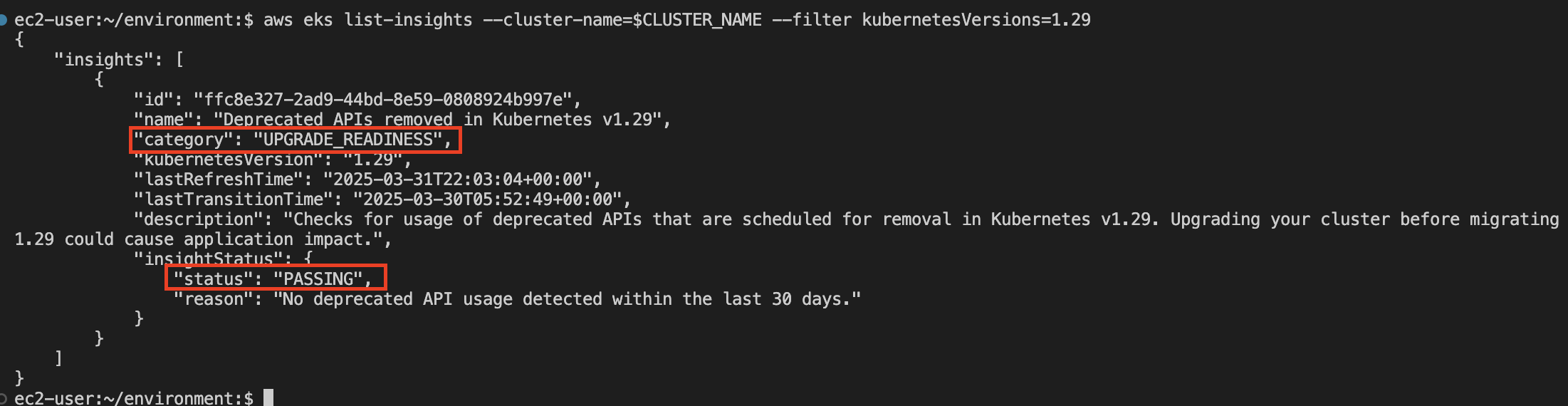 aws eks list-insights --cluster-name=$CLUSTER_NAME --filter kubernetesVersions=1.29