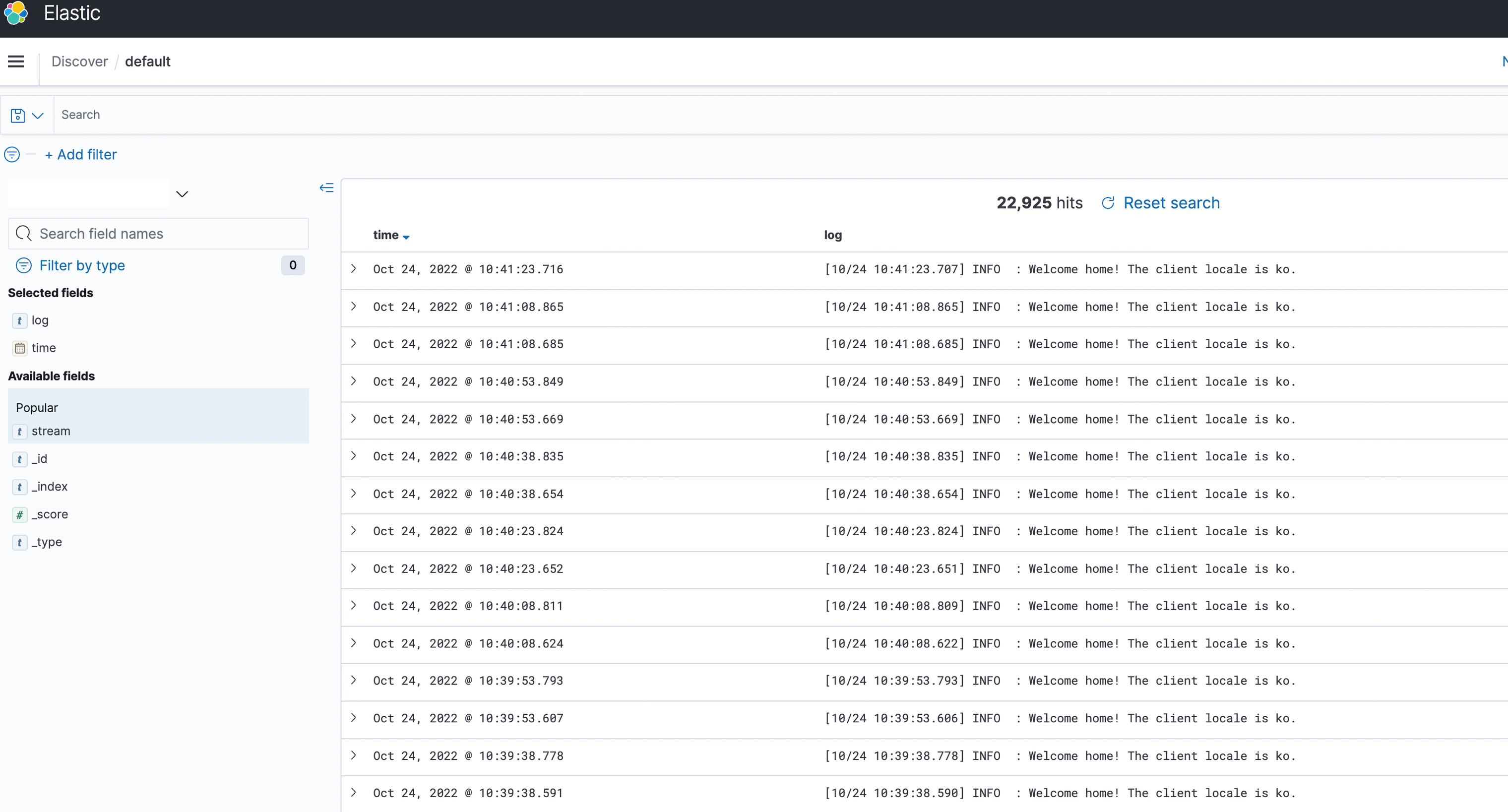 Index patterns 설정을 먼저 하고 kibana의 Discover 메뉴에 접속하면 정상적으로 로그가 쌓이는 것을 확인할 수 있다.