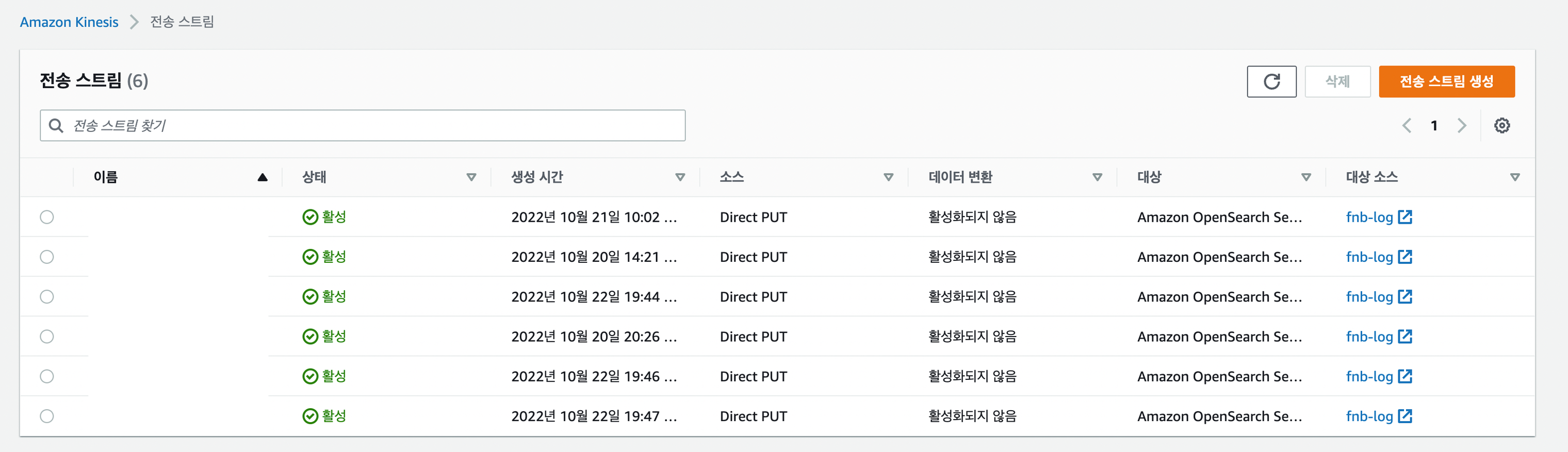 k8s내 파드들의 로그를 수집하는 fluent-bit가 노드별로 DaemonSet에 존재하고 fluent-bit에서 AWS Kinesis Datafirehose를 통해 AWS OpenSearch의 ElasticSearch로 전송하며 Kibana를 통해 시각화 하게 구성하였다.