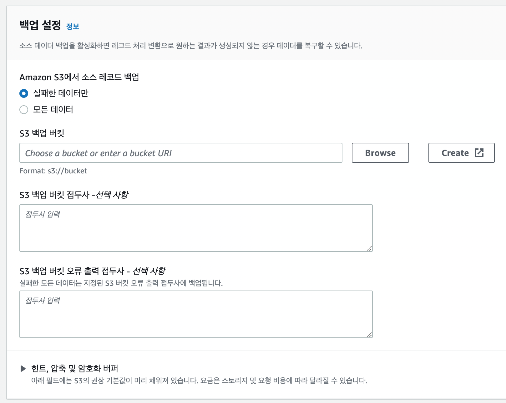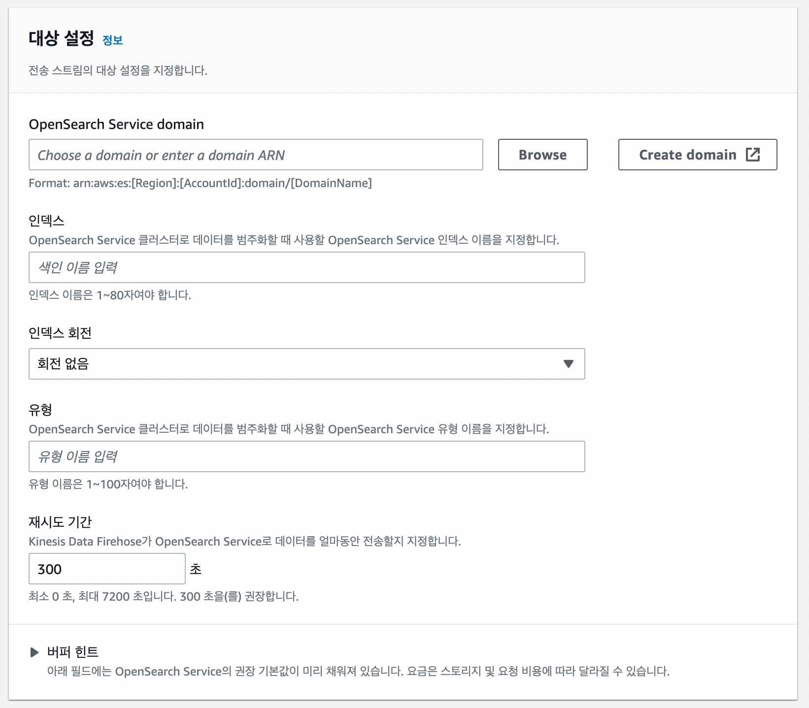 AWS Kinesis Data Firehose를 생성하기 전 AWS Opensearch Domain과 백업용 AWS S3 Buckect을 생성해야 한다.