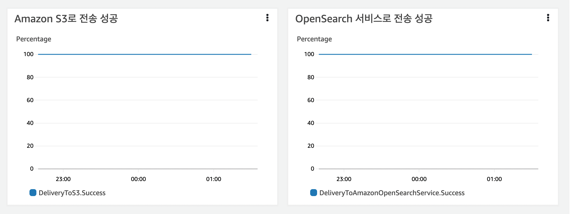 이제 AWS Kinesis로 접속하여 해당 DataFirehose에서 모니터링 탭에서 확인해보면 위의 사진 처럼 성공 그래프가 찍히는걸 볼 수 있다.
