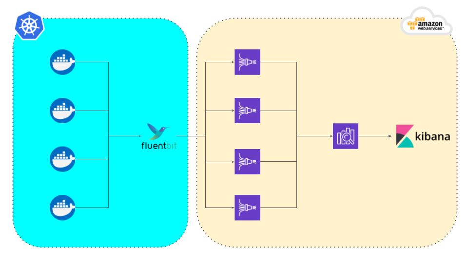 Pod로부터 수신된 로그를 Fluent-bit를 통해 AWS Kinesis로 전송하고, 수신된 로그 데이터를 AWS OpenSearch의 ElasticSearch가 받게 되고 Kibana를 통해 시각화하게 된다.