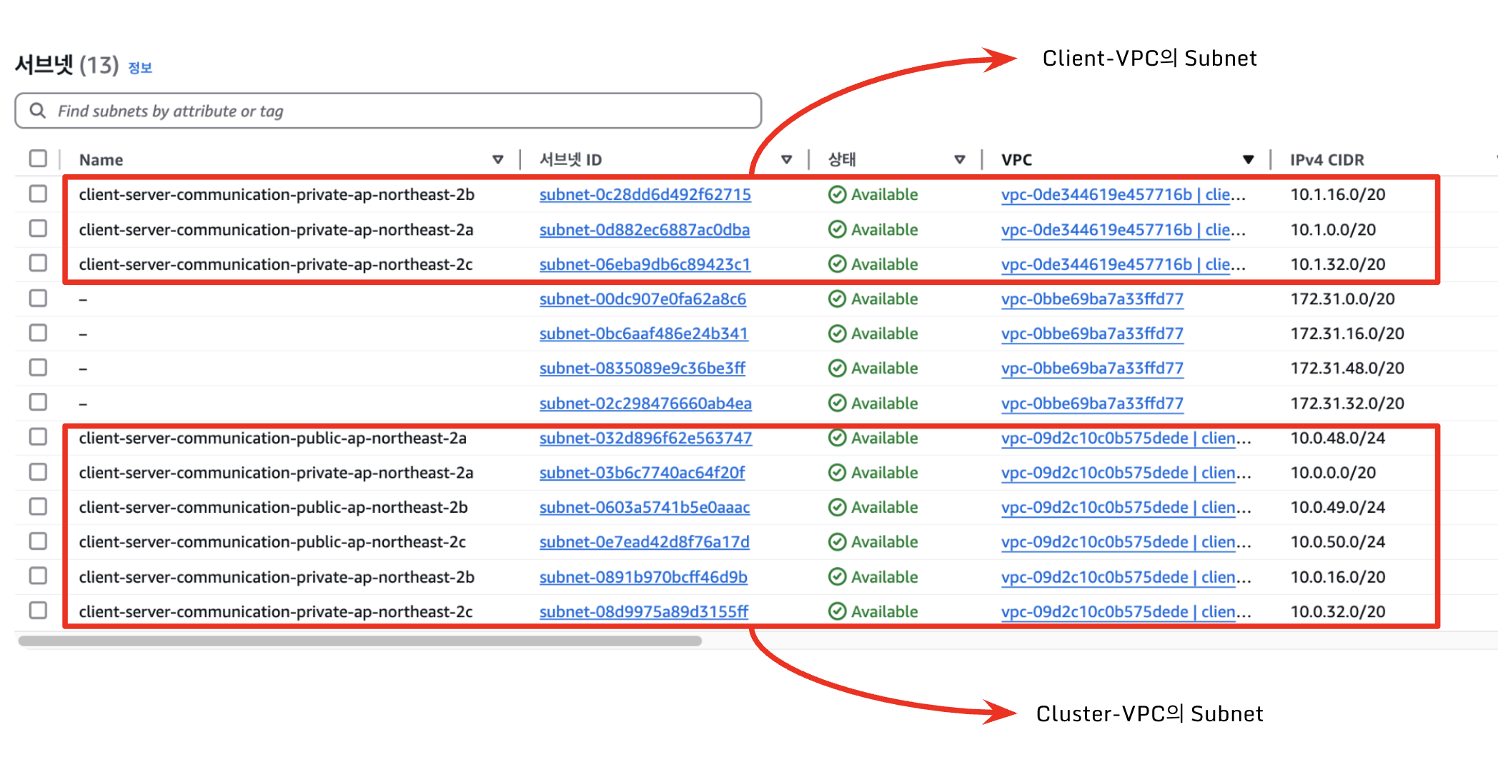 Client-VPC의 서브넷은 private subnet 3개로 구성되어 있으며, Cluster-VPC의 서브넷은 public subnet 3개, private subnet 3개로 구성되어 있습니다.