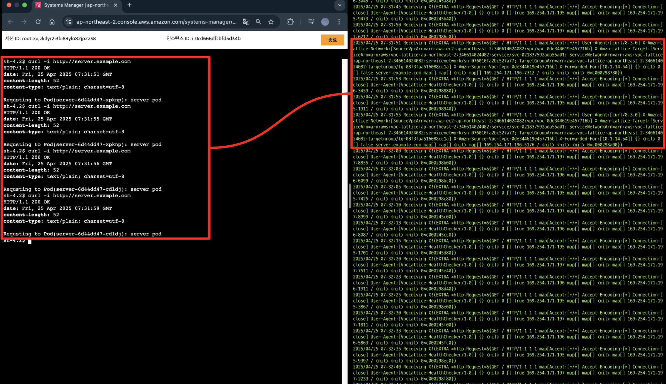위 내용은 클라이언트(curl)가 VPC Lattice를 통해 서비스로 HTTP GET 요청을 보냈고, Lattice 서비스 네트워크/서비스/타겟그룹을 거쳐 해당 서버에 도달했으며, 서버는 이 요청을 수신했고 Go의 http.Request 정보를 그대로 출력했다는 내용입니다.