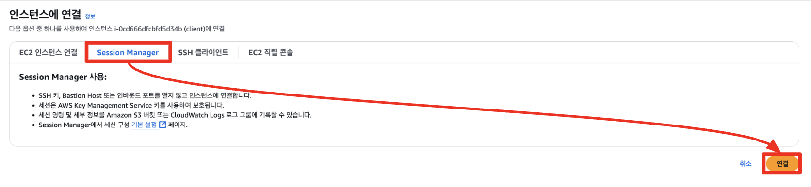 그 후 Session Manager 탭을 클릭 후 연결합니다.
