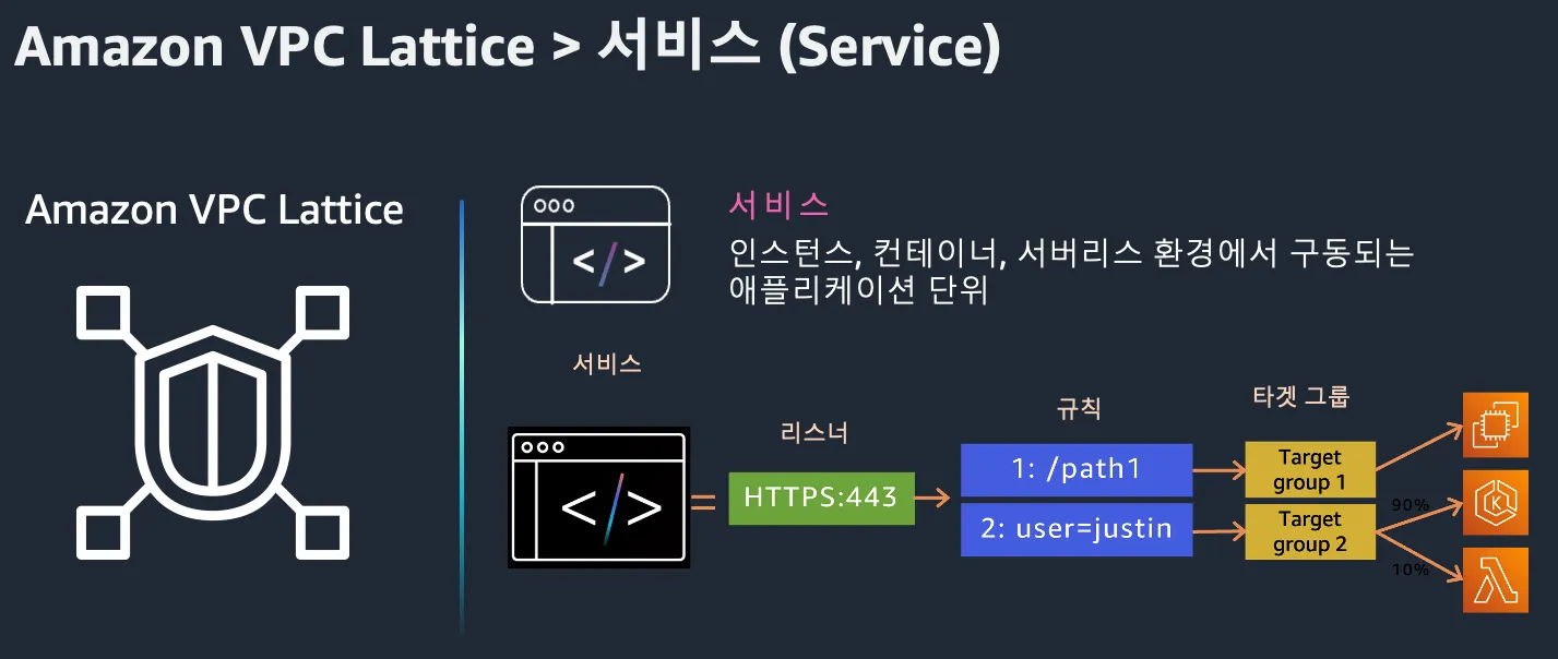 Amazon VPC Lattice에서 service는 독립적으로 배포 가능한 애플리케이션 단위입니다. 특히 account나 VPC내의 EC2 인스턴스, ECS/EKS/Fargate 컨테이너, Lambda 함수에서 실행되며, 각 서비스는 리스너, 규칙, target group으로 구성됩니다.