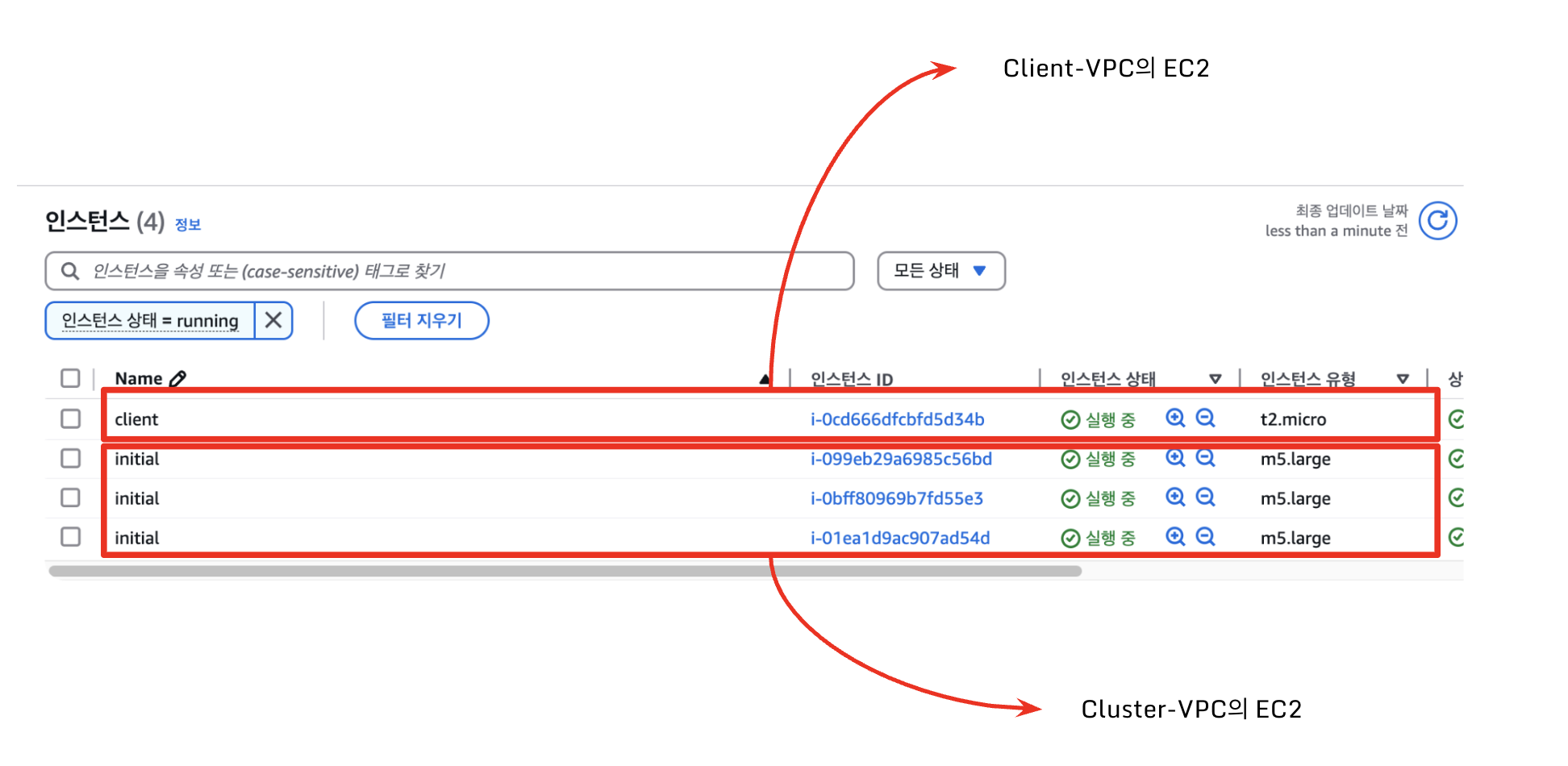 Client-VPC내의 워크로드로 1개의 EC22 인스턴스가 구성되어 있고, Cluster-VPC내의 워크로드로 3개의 EC2 인스턴스(워커 노드)가 구성되어 있습니다.