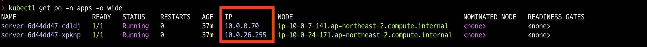 그 후 kubectl 명령어로 pod의 IP를 조회해보면 아래와 같이 매핑되어있는 IP가 조회되는 것을 확인하실 수 있습니다.