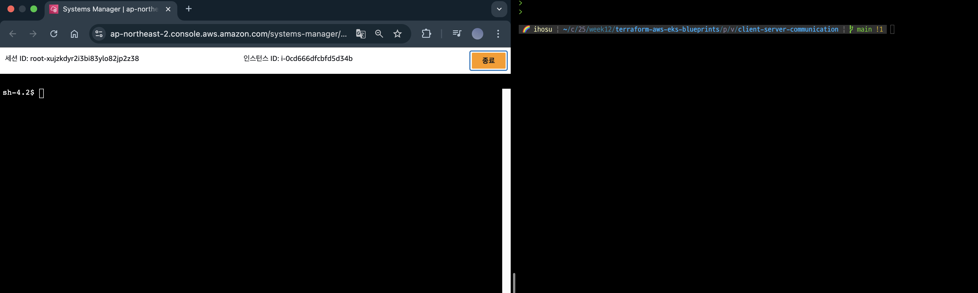 위와 같이 한쪽엔 EC2 Session Manager 화면, 다른 한쪽에는 Cluster Terminal 화면을 띄어놓겠습니다.