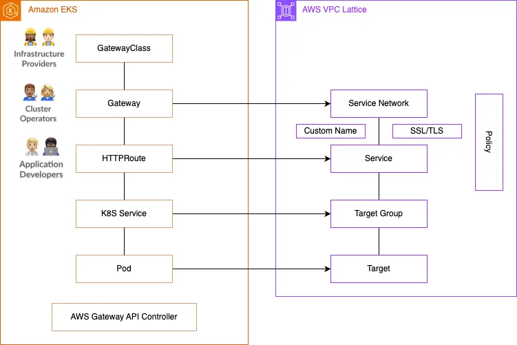 AWS Gateway API Controller는 Kubernetes Gateway API에서 정의된 사용자 지정 리소스(CRD)를 확장하여, Kubernetes API를 통해 Amazon VPC Lattice 리소스를 생성할 수 있도록 해줍니다.