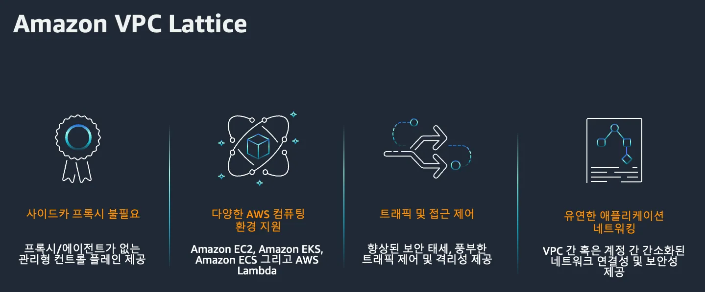 즉, Amazon VPC Lattice는 다양한 AWS 계정과 VPC에 분산된 애플리케이션 구성 요소들을 안전하고 일관되게 연결/보호/모니터링할 수 있도록 지원하는 완전관리형 애플리케이션 네트워킹 서비스입니다.