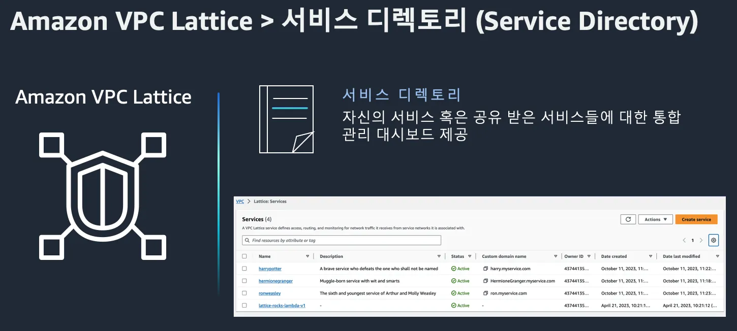 Service Directory는 모든 VPC Lattice 서비스를 중앙에서 검색하고 관리할 수 있는 대시보드입니다. 이를 통해 개발자와 운영팀이 사용 가능한 서비스를 쉽게 찾고 접근할 수 있도록 지원합니다.
