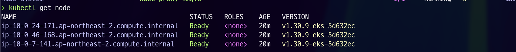 또한, kubectl 명령을 수행하면 EKS cluster의 워커 노드를 확인하실 수 있습니다.