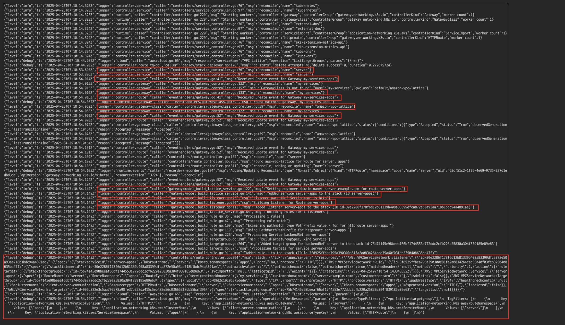 kubectl logs deployment/aws-gateway-api-controller-aws-gateway-controller-chart -n aws-application-networking-system --all-containers=true > lattice.log