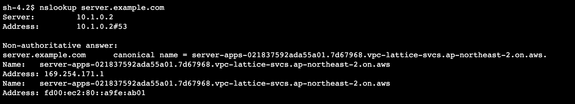 Amazon VPC Lattice의 네트워크 구성을 통해 server.example.com은 정상적으로 VPC Lattice 내부 경로로 해석되고 있고, Lattice가 사용하는 169.254.171.0/24 대역은 Lattice 프록시 엔드포인트로 예약된 주소인 것을 알 수 있습니다.