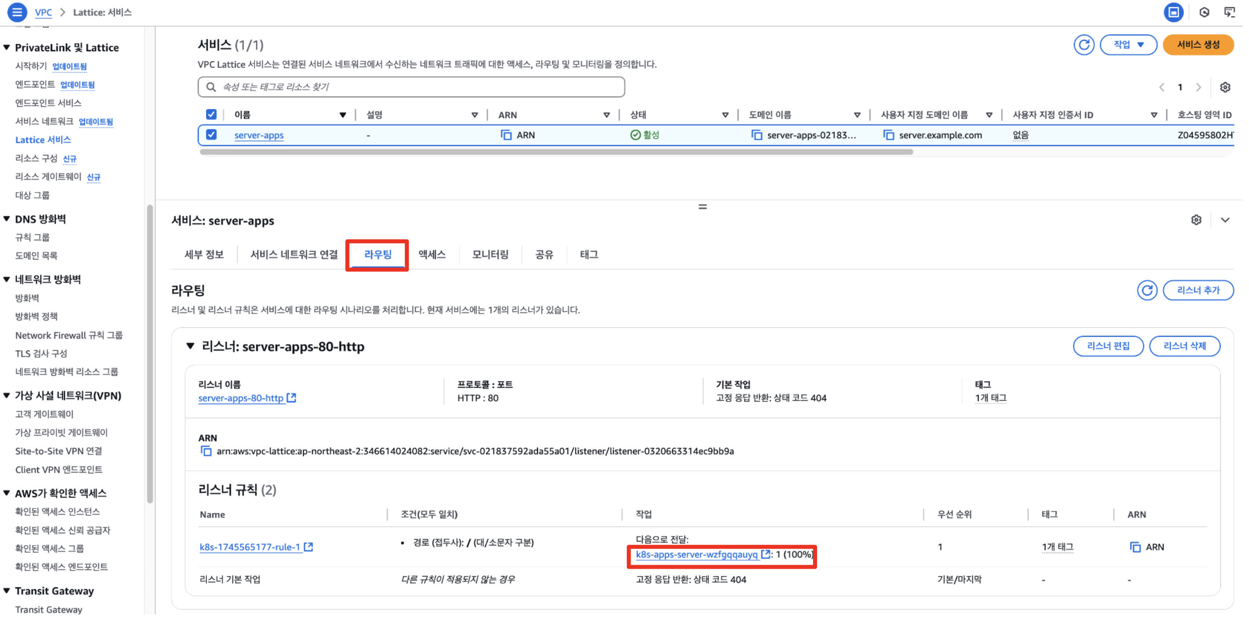 - VPC Lattice Service에 대해 Listener rule을 생성