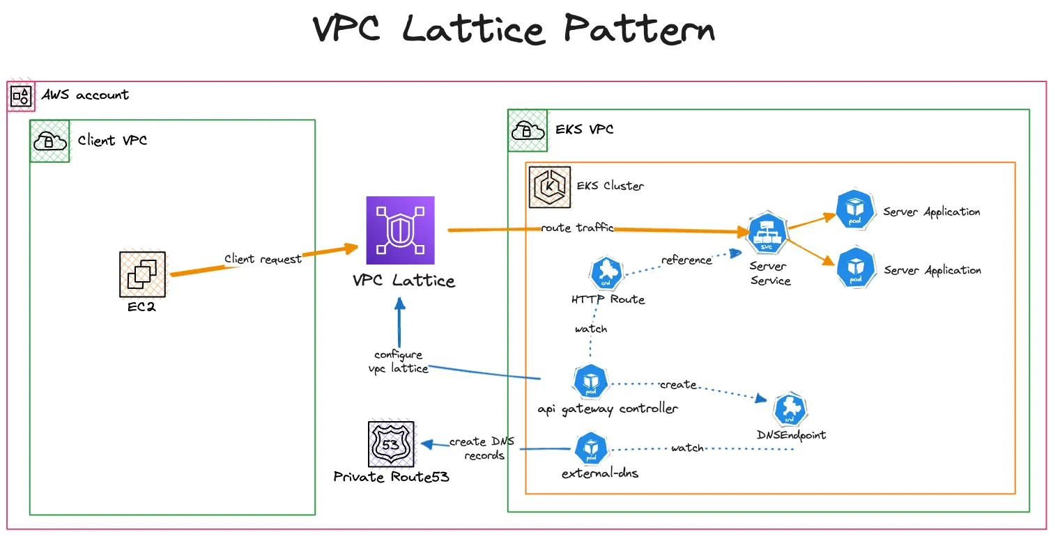 Amazon VPC Lattice - Simple Client to Server Communication This pattern demonstrates how to expose an EKS cluster hosted application to an internal consumer through Amazon VPC Lattice. Scenario With this solution we showcase how to configure Amazon VPC Lat