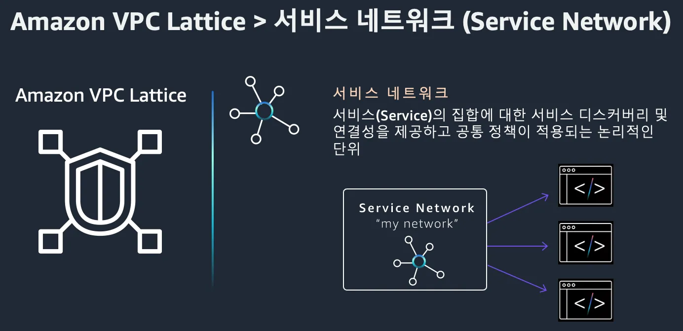 Service Network는 VPC Lattice의 핵심 구성 요소로, 여러 service를 논리적으로 그룹화하고 이들 간의 통신을 관리합니다. 특히, 하나 이상의 VPC를 Service Network에 연결하여 해당 네트워크 내의 서비스 간 통신을 가능하게 합니다.