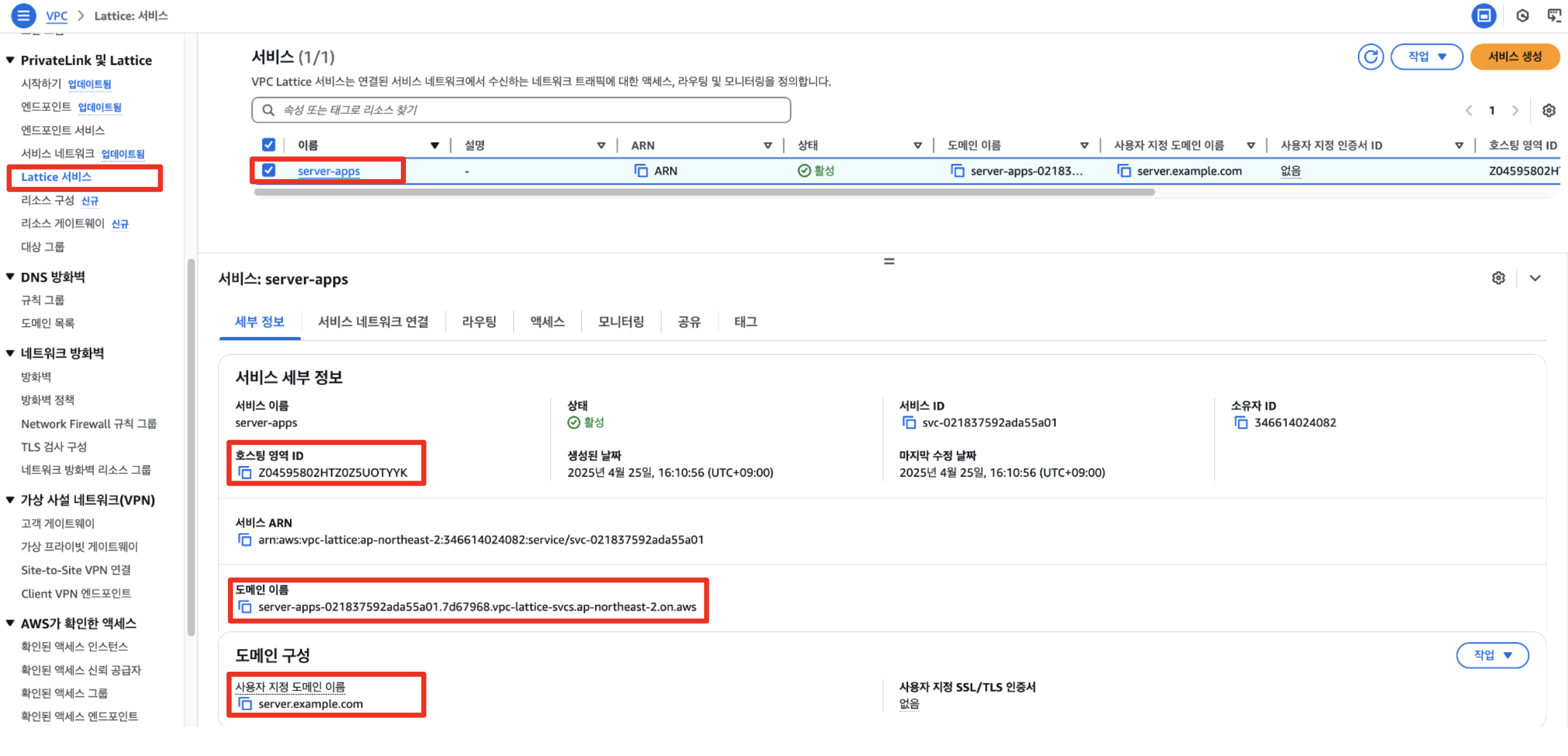 Console에서 VPC 페이지에 접근하신 후 왼쪽 탭에서 [Lattice 서비스]를 클릭하신 수 배포되어있는 service를 선택합니다. 그 후 호스팅 영역과 도메인 이름, 구성을 확인합니다.
