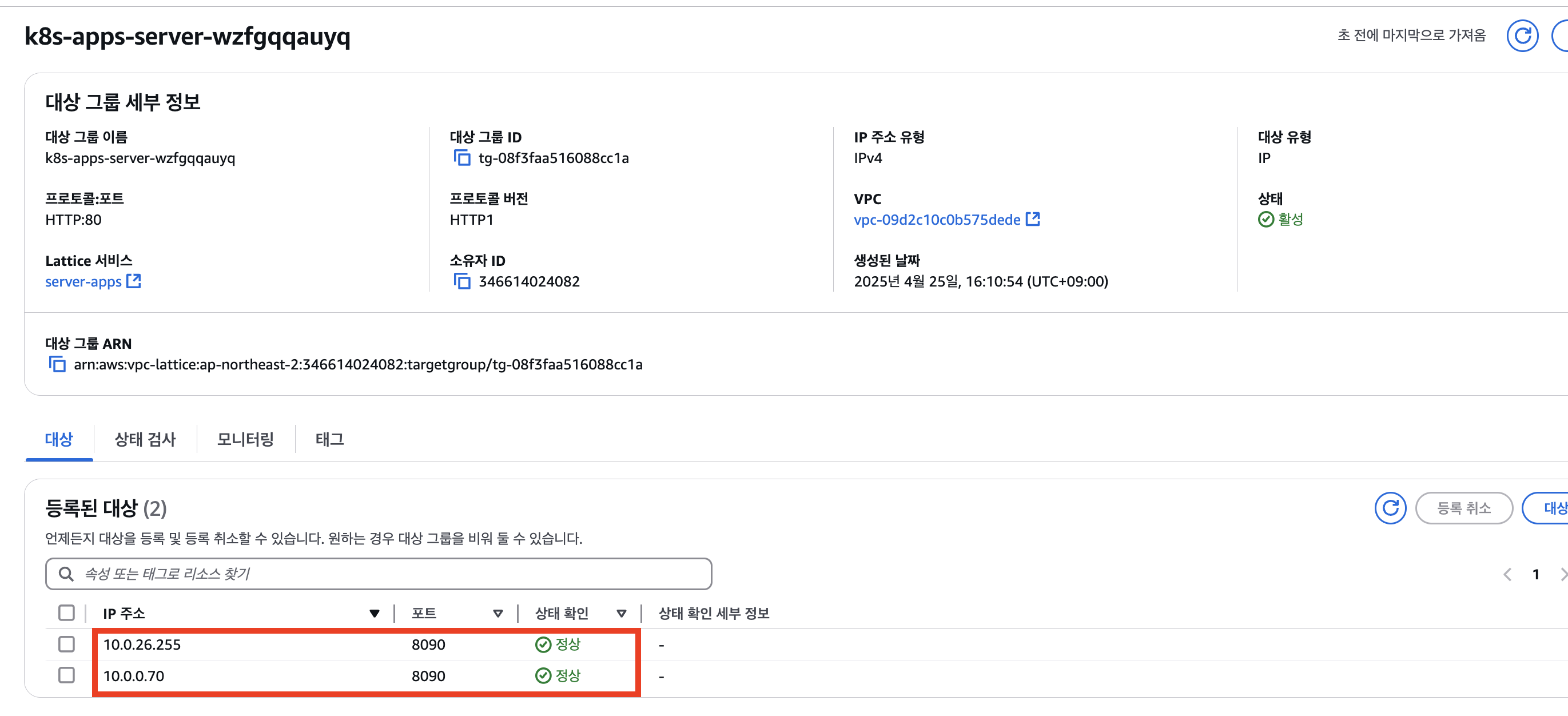 위의 대상 그룹을 클릭 후 등록된 대상(Registered targets)에서 IP 주소와 포트 번호를 통해 VPC Lattice Service로의 라우팅 대상이 설정되어 있는 것을 확인하실 수 있습니다.