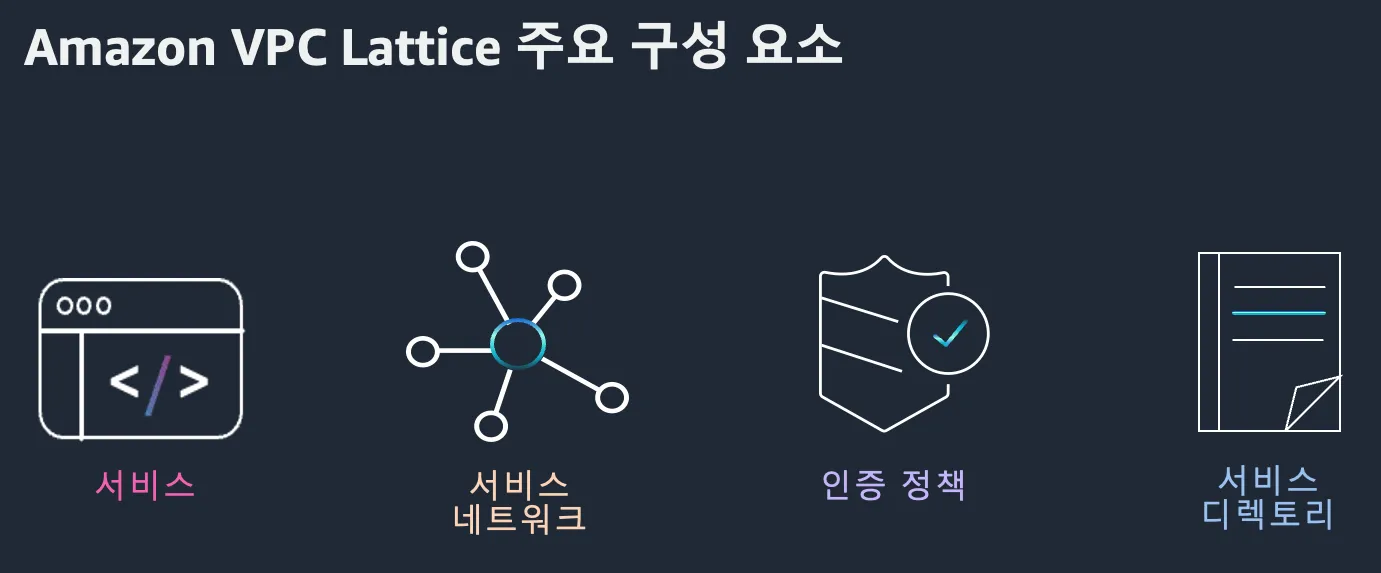 Amazon VPC Lattice는 Service, Service Network, Auth Policy, Service Directory의 네 가지 핵심 구성 요소로 구성되어있습니다.