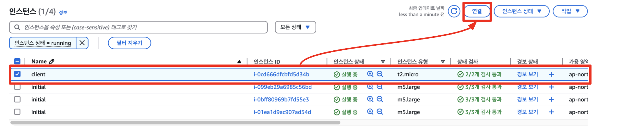 client라는 이름의 EC2를 클릭한 후 상단에 [연결] 버튼을 클릭합니다.