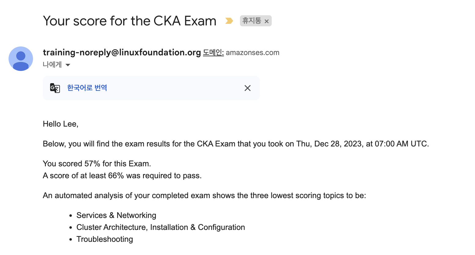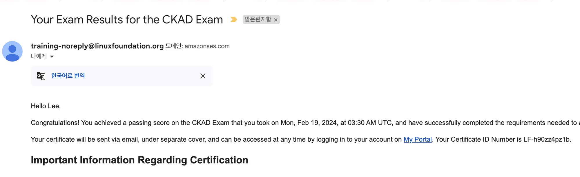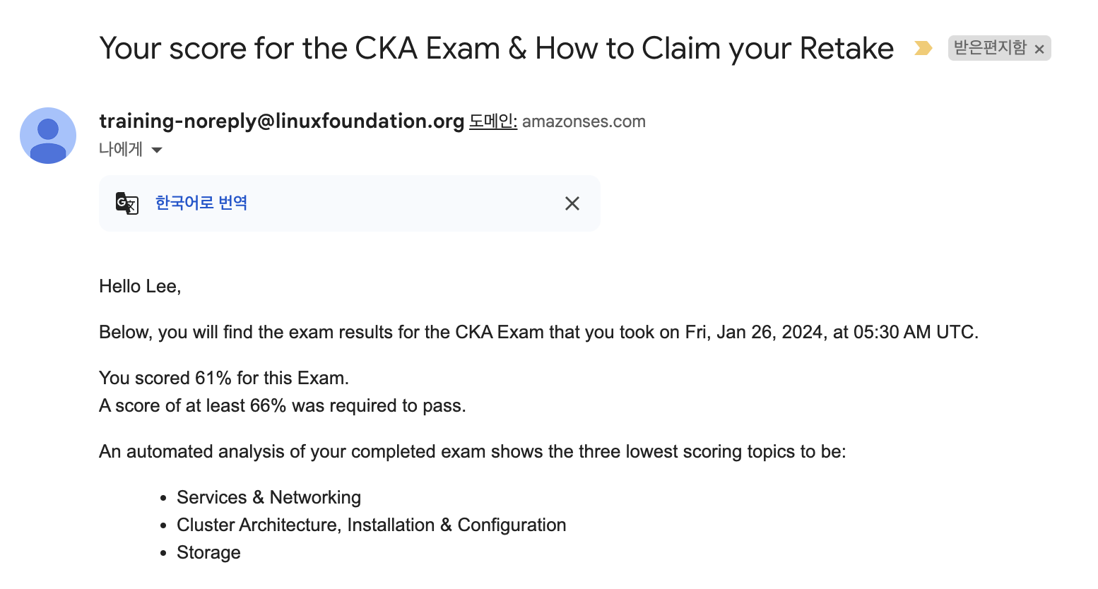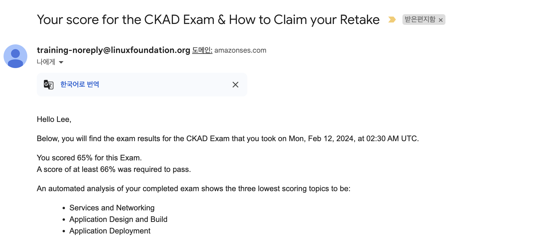 시험에 떨어지면 하나의 메일이 오게 되고, 합격하게 되면 3개의 메일이 오게 됩니다. (그래서 시험을 보고 24시간이 지난 후 메일이 왔다는 알림이 올 때에 한번만 진동이 느껴지면 불합격임을 인지했고, 2번 이상온다 하면 합격임을 인지하고 결과를 확인했습니다..)