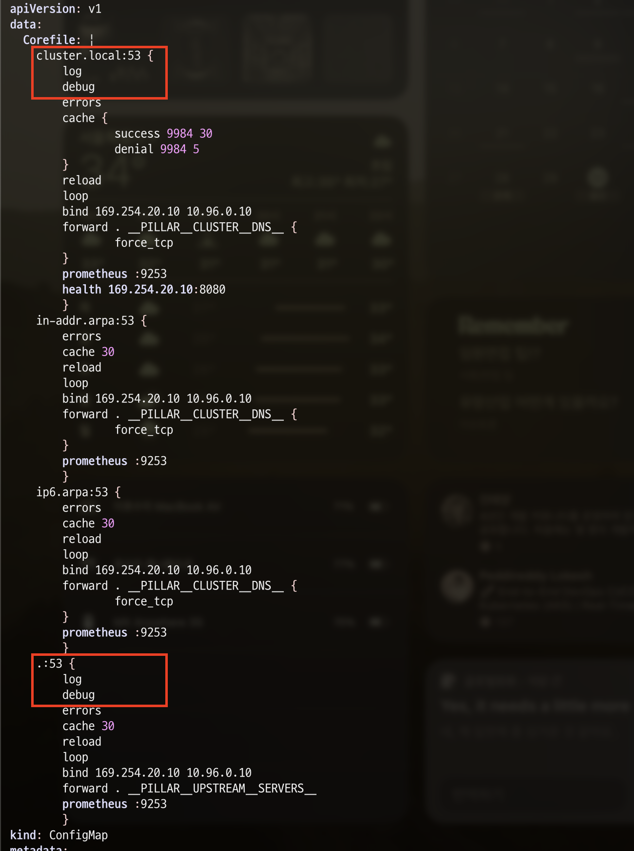 이번에도 위에서 했던 것과 마찬가지로 node-local-dns configmap에서 'cluster.local' 과 '.:53' 에 log, debug를 추가합니다.