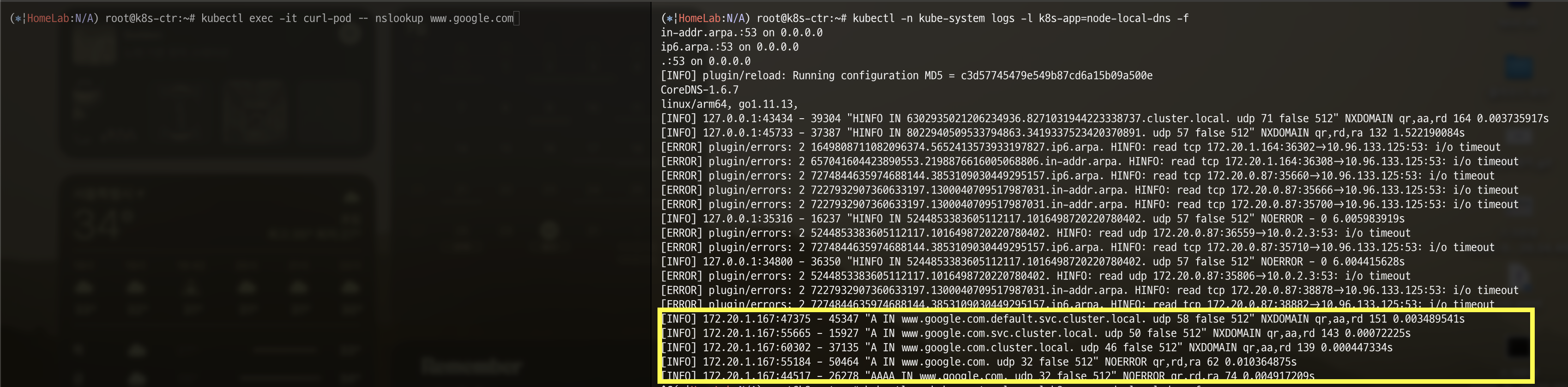 실제로 dns 질의 시 어떻게 동작하는지 확인해보기 위해 kube-dns와 node-local-dns pod에 로그를 실시간으로 확인해보겠습니다.