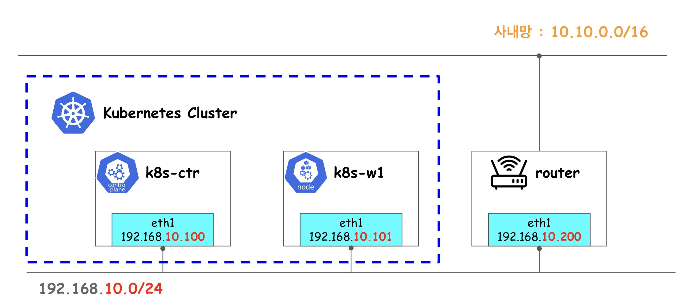 vagrant를 통해 k8s-ctr, k8s-w1, router로 총 3개의 실습 환경을 구성합니다.