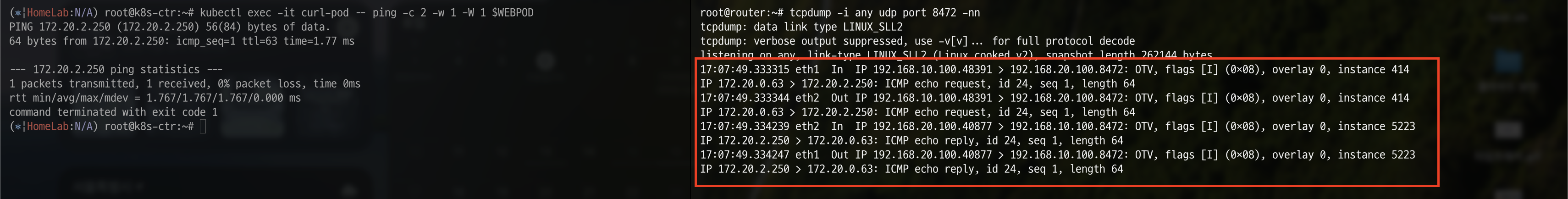 router 노드에서 192.168.10.100으로부터 192.168.20.100의 eth0으로 요청을 받았고, 해당 요청을 내부 VXLAN 페이로드인 172.20.0.63에서 172.20.2.250으로 전달했다는 것을 확인할 수 있습니다.
