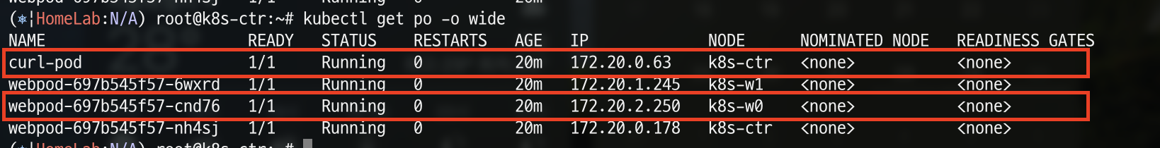 현재 배포되어 있는 pod을 확인해보면 172.20.0.63은 curl-pod이고, 요청을 받은 172.20.2.250은 k8s-w0에 배포되어 있는 webpod인 것을 확인할 수 있습니다.