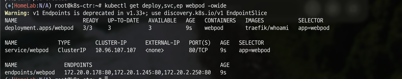 현재 webpod는 10.96.107.107의 내부 IP를 가지며, 세 개의 파드 IP (172.20.0.178, 172.20.1.245, 172.20.2.250)로 endpoint가 설정되어 있는 것을 확인할 수 있습니다.