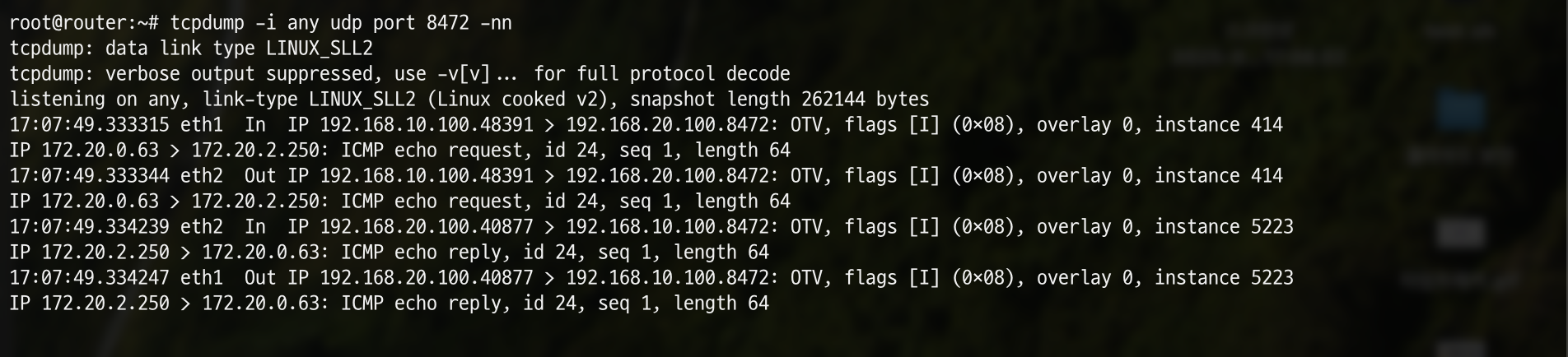 17:07:49.333315 eth1 In IP 192.168.10.100.48391 > 192.168.20.100.8472: OTV, flags [I] (0x08), overlay 0, instance 414