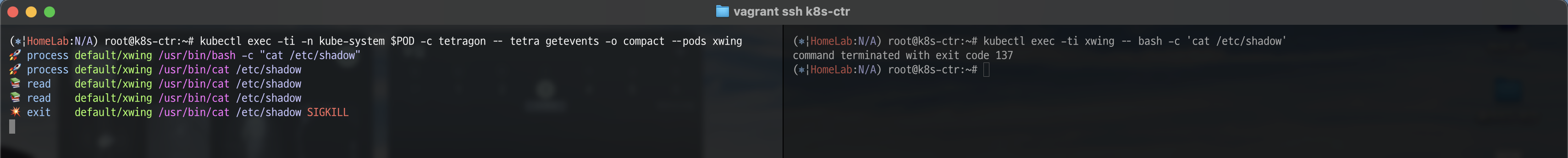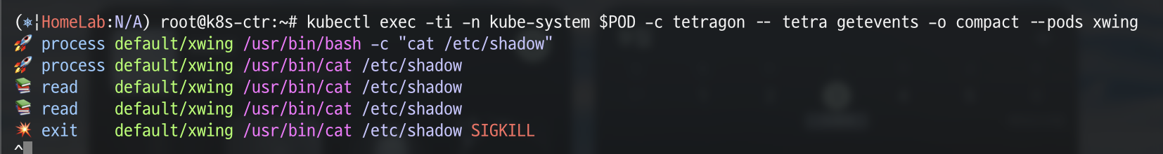 xwing 파드에서 cat /etc/shadow 명령 실행을 Tetragon이 추적하고, 정책 위반으로 인해 강제 종료(SIGKILL)된 과정을 확인할 수 있습니다.