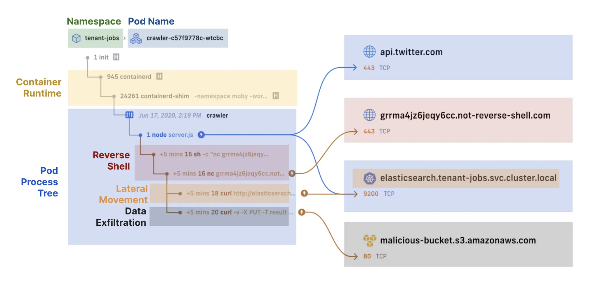 - default 네임스페이스의 xwing 파드 안에서 usr/bin/bash -c 로 curl 명령이 실행됨을 감지
