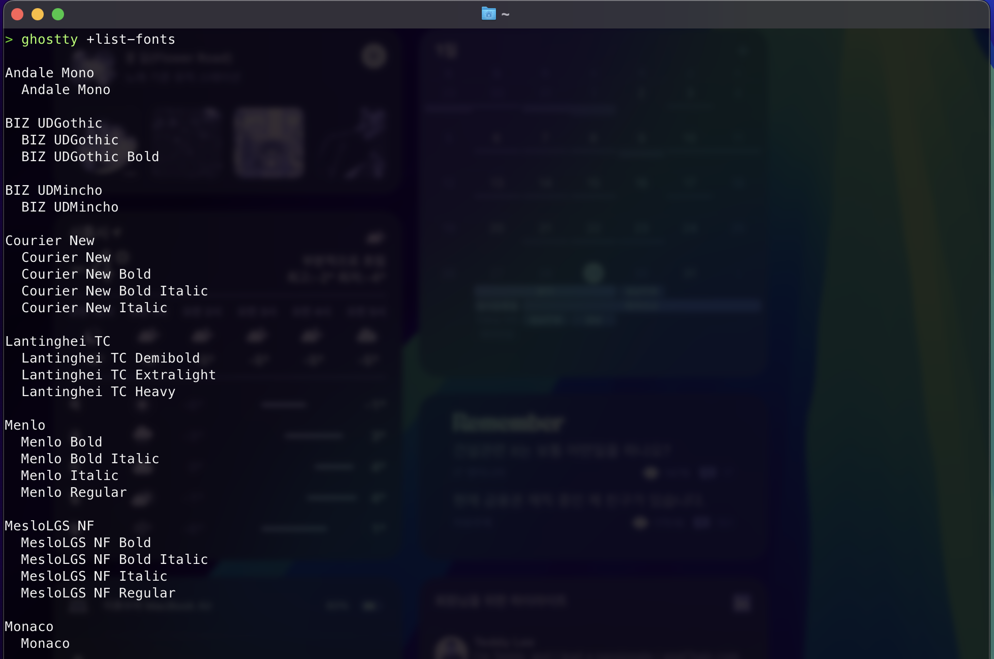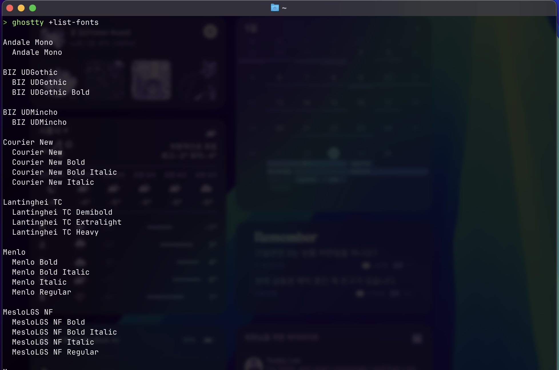 이유는 Ghostty는 아직 모든 font에 대해 CJK(China, Japan, Korea)가 지원되지 않습니다. 그렇기에 CJK를 지원하는 fallback font-family를 하나 더 지정해야 합니다.
