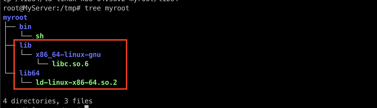 cp /lib64/ld-linux-x86-64.so.2 /tmp/myroot/lib64/;