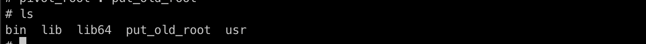 사용법은 정말 간단한데요. 위의 명령어처럼 pivot_root 명령어를 통해 현재 경로에 기존 root를 넣어줍니다. pivot_root 는 실행 시, 변경될 root 파일시스템 경로로 진입하게 됩니다.