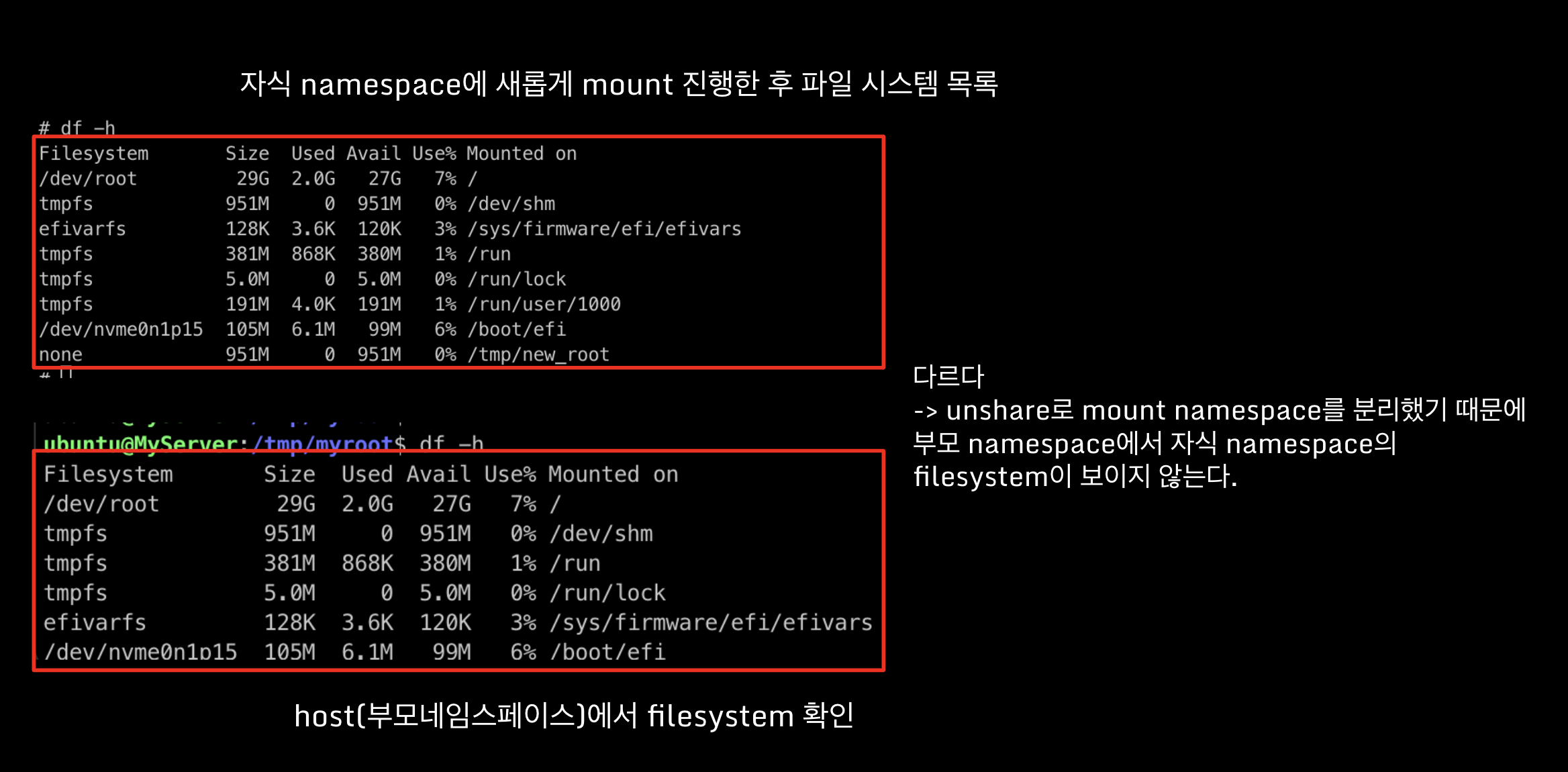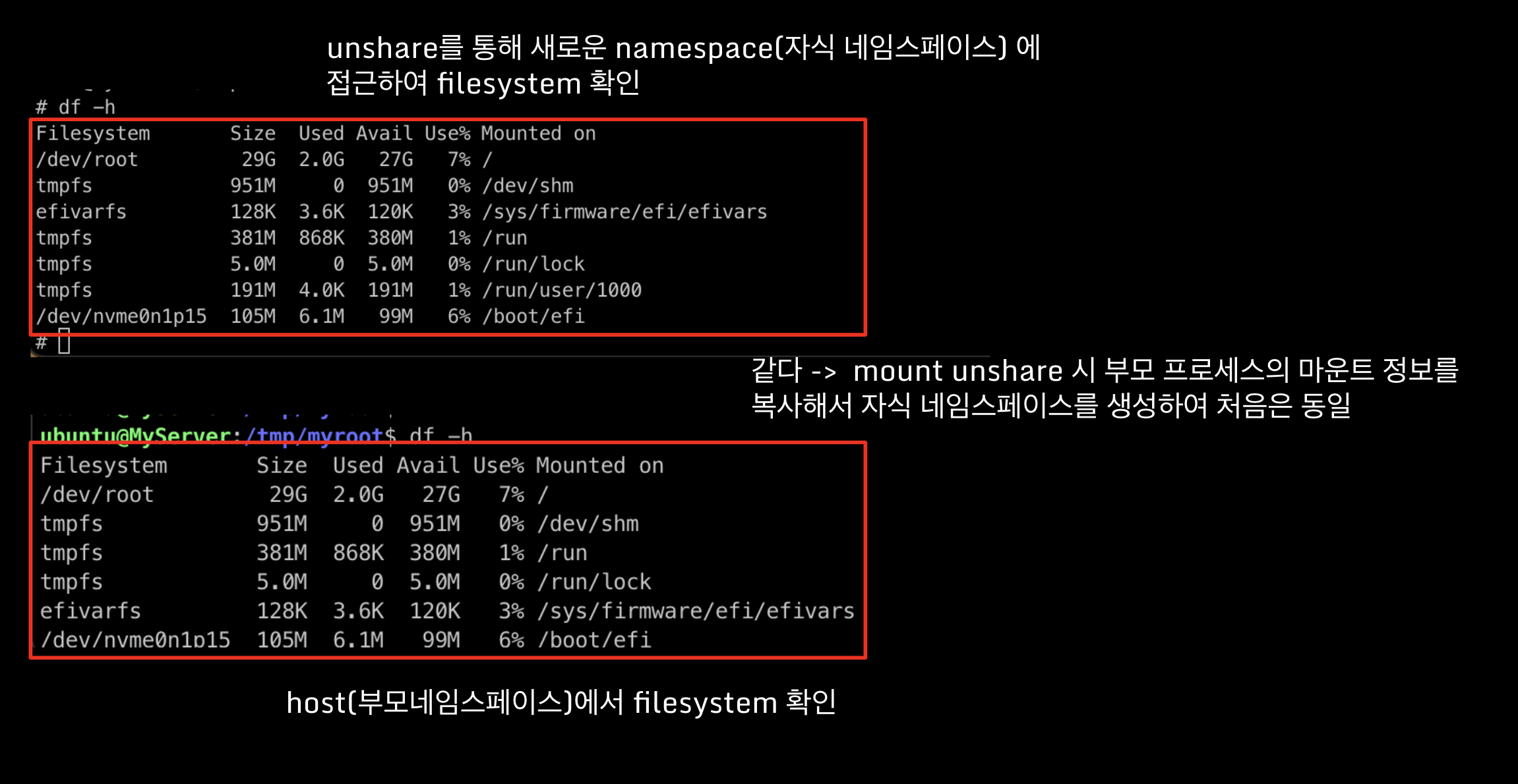 부모 네임스페이스의 mount 정보와 자식 네임스페이스의 mount정보가 같습니다. 왜냐하면 mount unshare 시 부모 프로세스의 마운트 정보를 복사해서 자식 네임스페이스를 생성하여 처음은 동일하기 때문입니다.